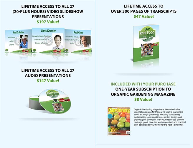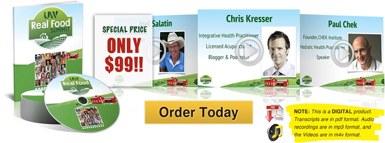 The Real Food Summit Take-Home Package is 9 days (over 20 hours!) of video/audio presentations from real farmers, doctors, researchers, and authors that will give you all of the information you need to end the diet madness once and for all.